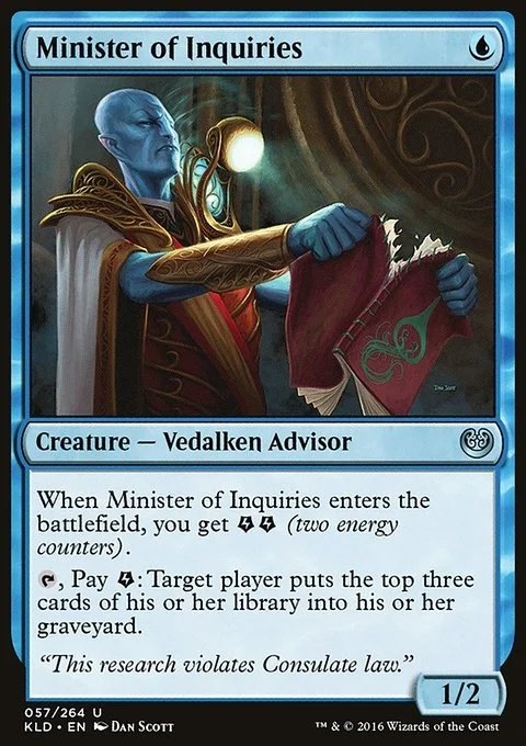 When Minister of Inquiries enters the battlefield, you get {E}{E} (two energy counters). {T}, Pay {E}: Target player mills three cards.