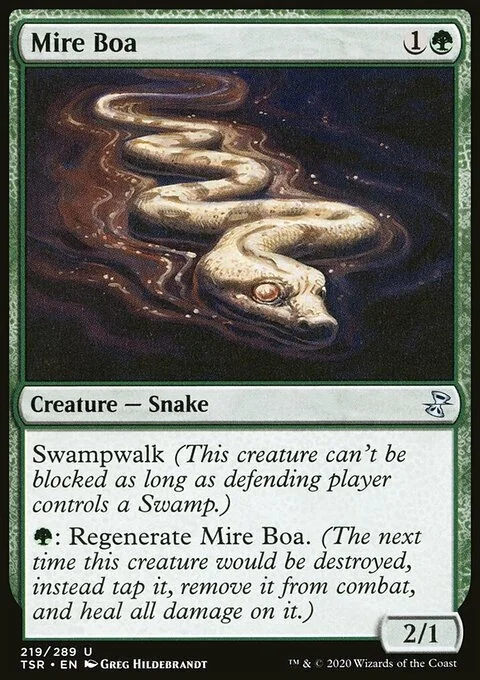 Swampwalk (This creature can't be blocked as long as defending player controls a Swamp.) {G}: Regenerate Mire Boa. (The next time this creature would be destroyed, instead tap it, remove it from combat, and heal all damage on it.)