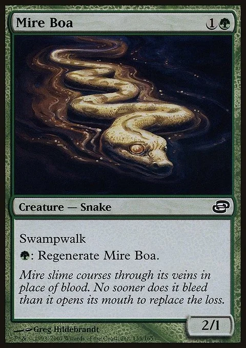 Swampwalk (This creature can't be blocked as long as defending player controls a Swamp.) {G}: Regenerate Mire Boa. (The next time this creature would be destroyed, instead tap it, remove it from combat, and heal all damage on it.)