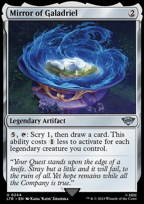 {5}, {T}: Scry 1, then draw a card. This ability costs {1} less to activate for each legendary creature you control.