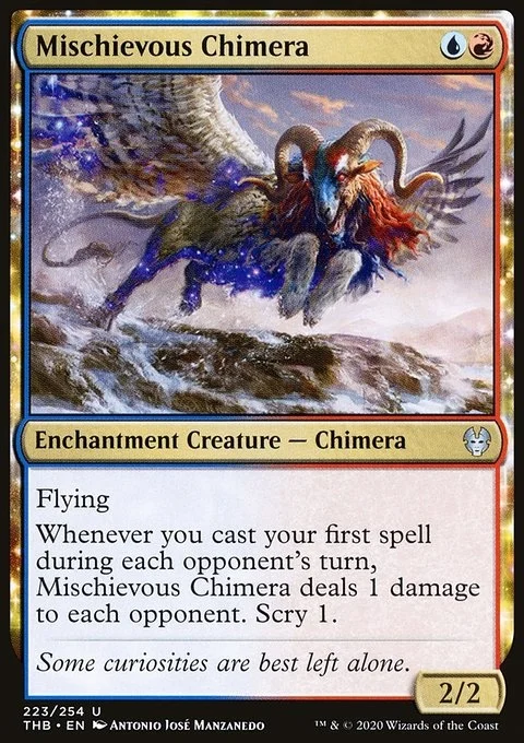 Flying Whenever you cast your first spell during each opponent's turn, Mischievous Chimera deals 1 damage to each opponent. Scry 1.