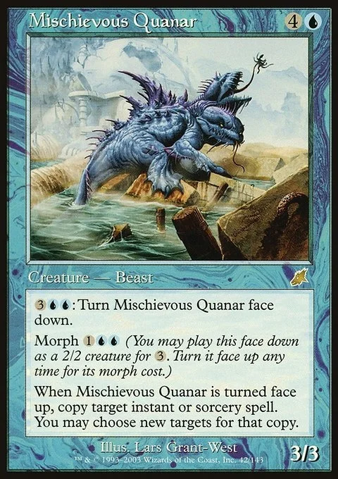 When Mischievous Quanar is turned face up, copy target instant or sorcery spell. You may choose new targets for that copy.