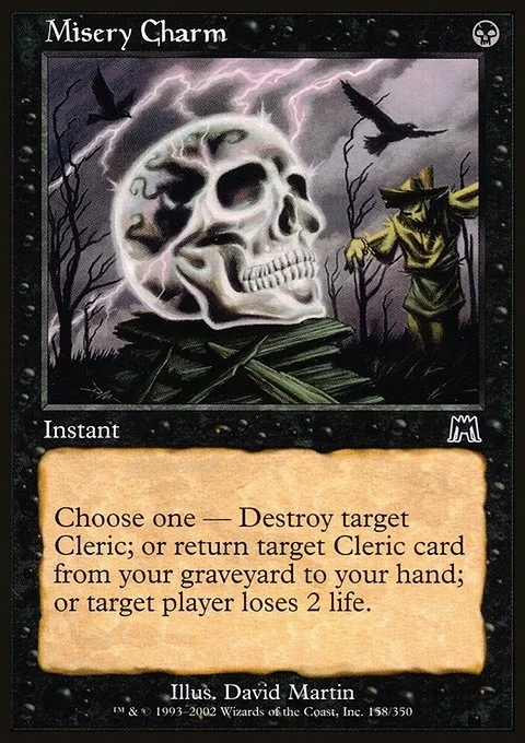 Choose one — • Destroy target Cleric. • Return target Cleric card from your graveyard to your hand. • Target player loses 2 life.