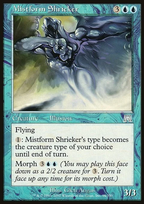 Flying {1}: Mistform Shrieker becomes the creature type of your choice until end of turn. Morph {3}{U}{U} (You may cast this card face down as a 2/2 creature for {3}. Turn it face up any time for its morph cost.)