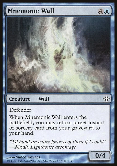 Defender When Mnemonic Wall enters, you may return target instant or sorcery card from your graveyard to your hand.