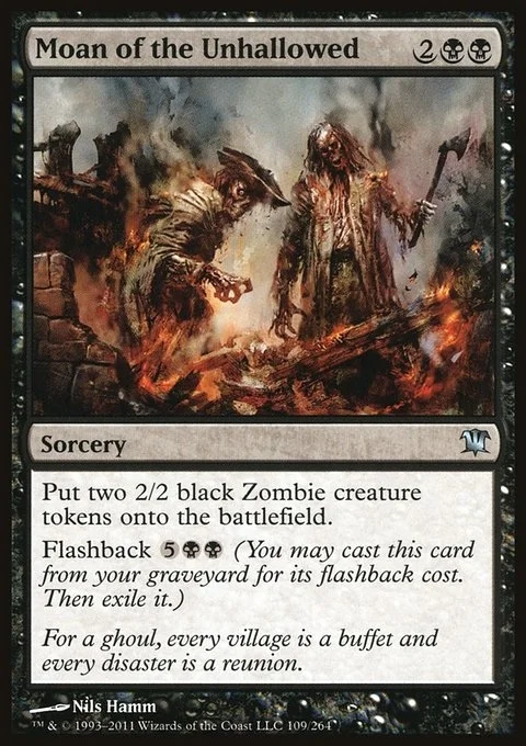 Create two 2/2 black Zombie creature tokens. Flashback {5}{B}{B} (You may cast this card from your graveyard for its flashback cost. Then exile it.)