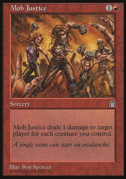 Mob Justice deals damage to target player or planeswalker equal to the number of creatures you control.