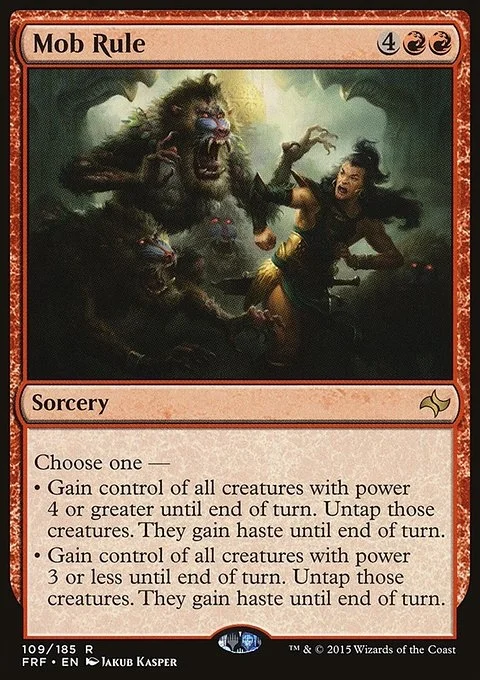 Choose one — • Gain control of all creatures with power 4 or greater until end of turn. Untap those creatures. They gain haste until end of turn. • Gain control of all creatures with power 3 or less until end of turn. Untap those creatures. They gain haste until end of turn.