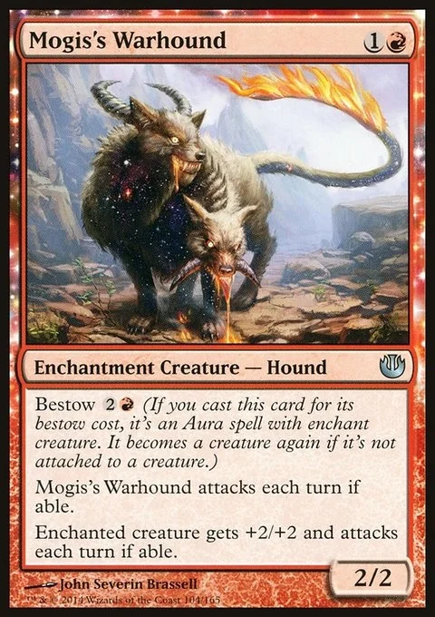 Bestow {2}{R} (If you cast this card for its bestow cost, it's an Aura spell with enchant creature. It becomes a creature again if it's not attached to a creature.) Mogis's Warhound attacks each combat if able. Enchanted creature gets +2/+2 and attacks each combat if able.