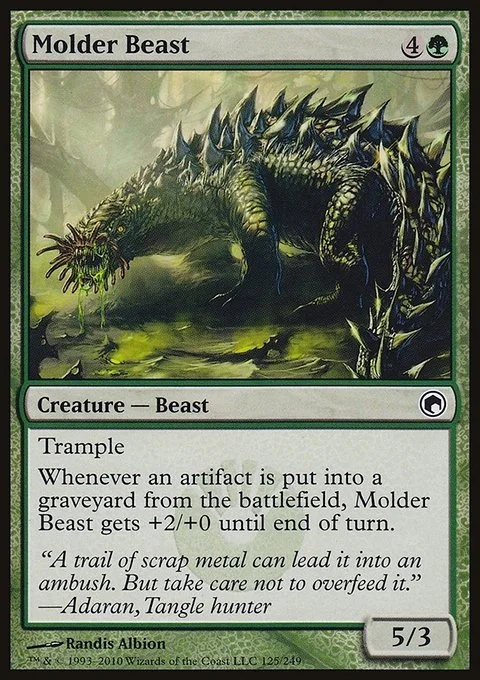 Trample Whenever an artifact is put into a graveyard from the battlefield, Molder Beast gets +2/+0 until end of turn.