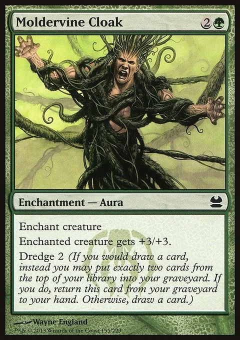 Enchant creature Enchanted creature gets +3/+3. Dredge 2 (If you would draw a card, you may mill two cards instead. If you do, return this card from your graveyard to your hand.)