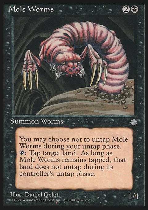 You may choose not to untap Mole Worms during your untap phase.T: Tap target land. As long as Mole Worms remains tapped, that land does not untap during its controller’s untap phase.