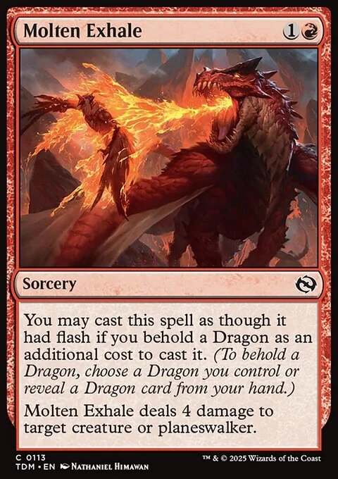 You may cast this spell as though it had flash if you behold a Dragon as an additional cost to cast it. (To behold a Dragon, choose a Dragon you control or reveal a Dragon card from your hand.) Molten Exhale deals 4 damage to target creature or planeswalker.