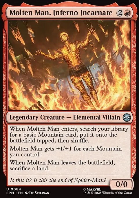 When Molten Man enters, search your library for a basic Mountain card, put it onto the battlefield tapped, then shuffle. Molten Man gets +1/+1 for each Mountain you control. When Molten Man leaves the battlefield, sacrifice a land.