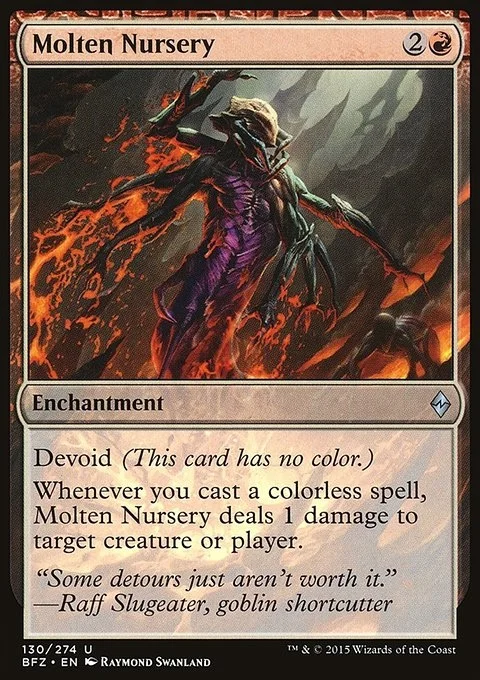 Devoid (This card has no color.) Whenever you cast a colorless spell, Molten Nursery deals 1 damage to any target.