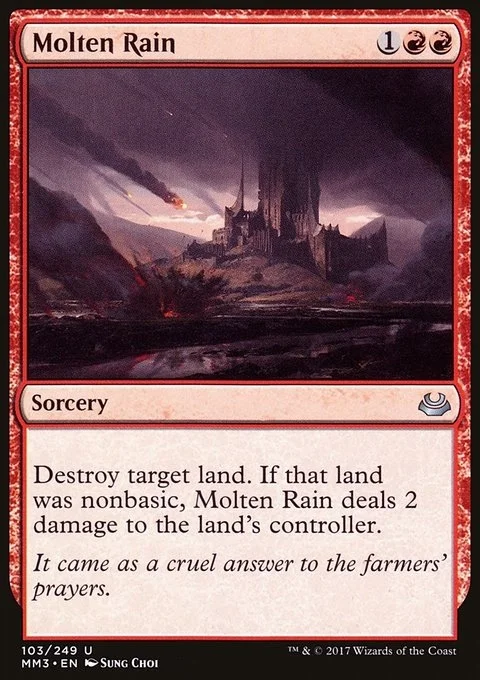 Destroy target land. If that land was nonbasic, Molten Rain deals 2 damage to the land's controller.