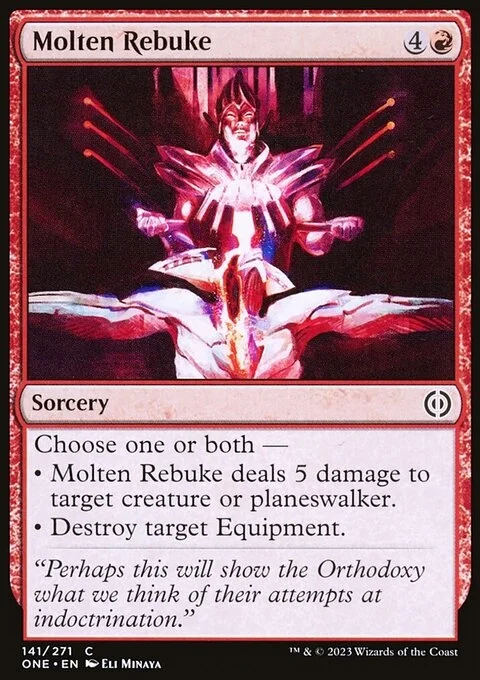 Choose one or both — • Molten Rebuke deals 5 damage to target creature or planeswalker. • Destroy target Equipment.
