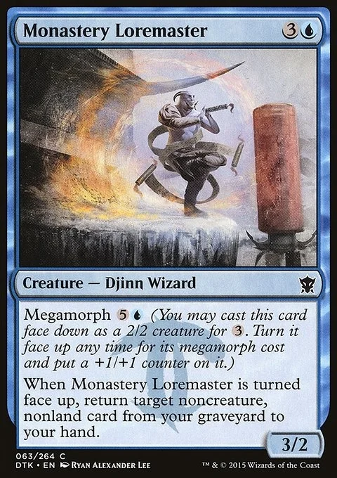 When Monastery Loremaster is turned face up, return target noncreature, nonland card from your graveyard to your hand.