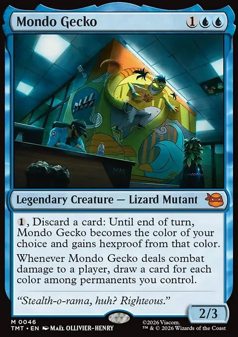 {1}, Discard a card: Until end of turn, Mondo Gecko becomes the color of your choice and gains hexproof from that color. Whenever Mondo Gecko deals combat damage to a player, draw a card for each color among permanents you control.