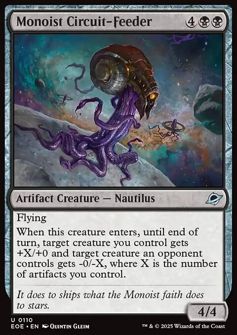 Flying When this creature enters, until end of turn, target creature you control gets +X/+0 and target creature an opponent controls gets -0/-X, where X is the number of artifacts you control.