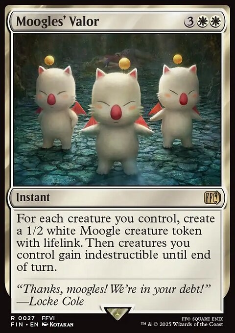 For each creature you control, create a 1/2 white Moogle creature token with lifelink. Then creatures you control gain indestructible until end of turn.