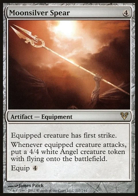 Equipped creature has first strike. Whenever equipped creature attacks, create a 4/4 white Angel creature token with flying. Equip {4}