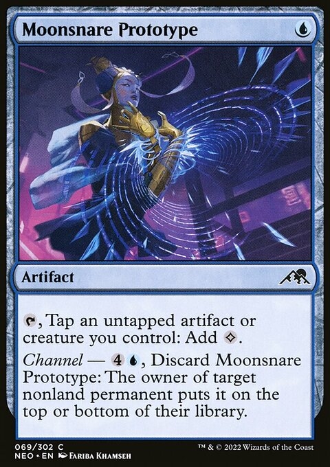 {T}, Tap an untapped artifact or creature you control: Add {C}. Channel — {4}{U}, Discard this card: The owner of target nonland permanent puts it on their choice of the top or bottom of their library.