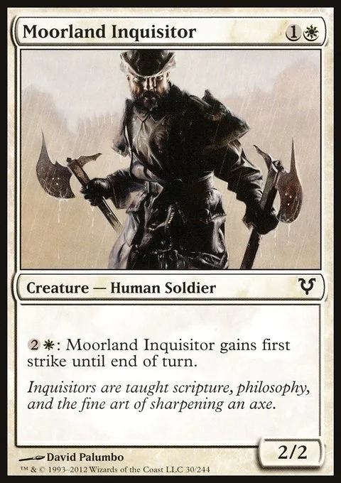 {2}{W}: Moorland Inquisitor gains first strike until end of turn. (It deals combat damage before creatures without first strike.)