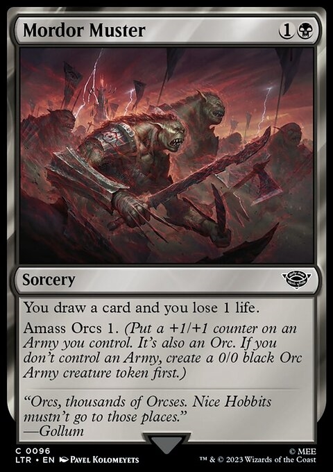 You draw a card and you lose 1 life. Amass Orcs 1. (Put a +1/+1 counter on an Army you control. It's also an Orc. If you don't control an Army, create a 0/0 black Orc Army creature token first.)