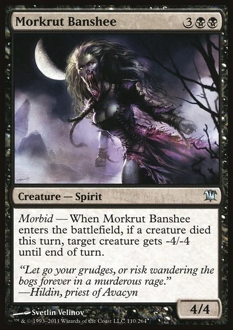 Morbid — When Morkrut Banshee enters the battlefield, if a creature died this turn, target creature gets -4/-4 until end of turn.