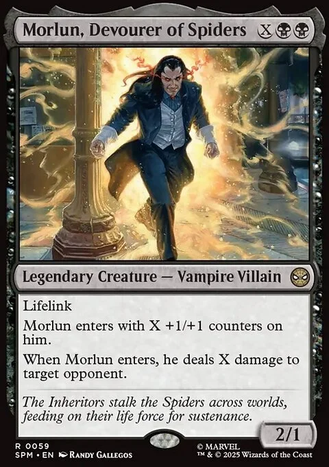 Lifelink Morlun enters with X +1/+1 counters on him. When Morlun enters, he deals X damage to target opponent.