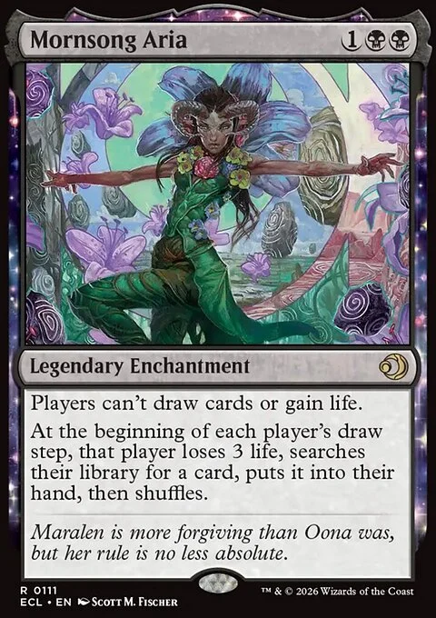 Players can't draw cards or gain life. At the beginning of each player's draw step, that player loses 3 life, searches their library for a card, puts it into their hand, then shuffles.