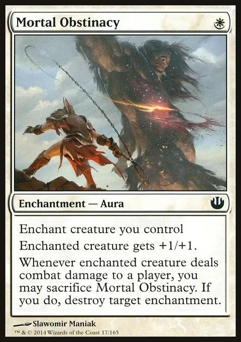 Enchant creature you control Enchanted creature gets +1/+1. Whenever enchanted creature deals combat damage to a player, you may sacrifice Mortal Obstinacy. If you do, destroy target enchantment.