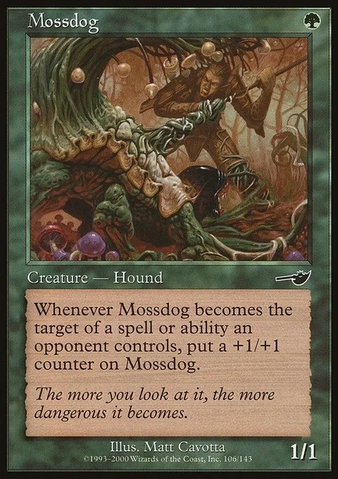 Whenever Mossdog becomes the target of a spell or ability an opponent controls, put a +1/+1 counter on Mossdog.