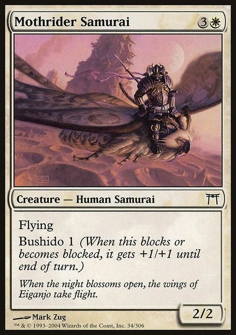 Flying Bushido 1 (Whenever this creature blocks or becomes blocked, it gets +1/+1 until end of turn.)