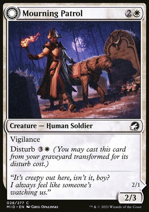 Mourning Patrol Vigilance Disturb {3}{W} (You may cast this card from your graveyard transformed for its disturb cost.) Morning Apparition Flying, vigilance If Morning Apparition would be put into a graveyard from anywhere, exile it instead.