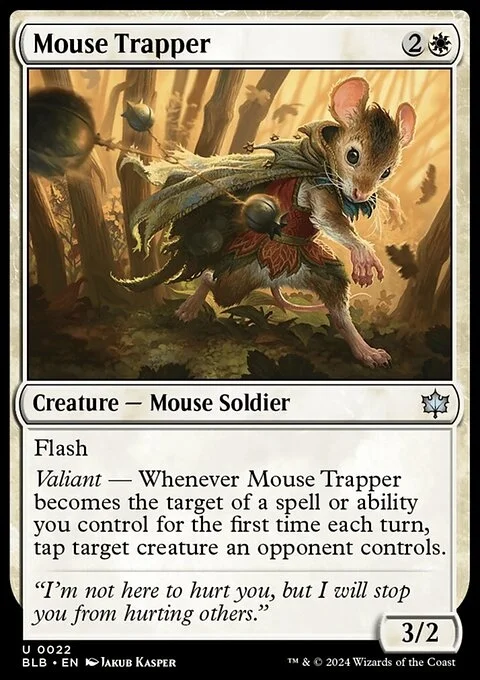 Flash Valiant — Whenever Mouse Trapper becomes the target of a spell or ability you control for the first time each turn, tap target creature an opponent controls.