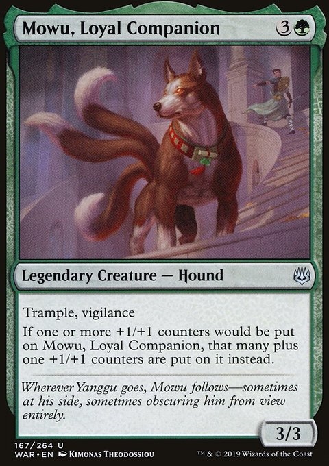 Vigilance, trample If one or more +1/+1 counters would be put on Mowu, Loyal Companion, that many plus one +1/+1 counters are put on it instead.