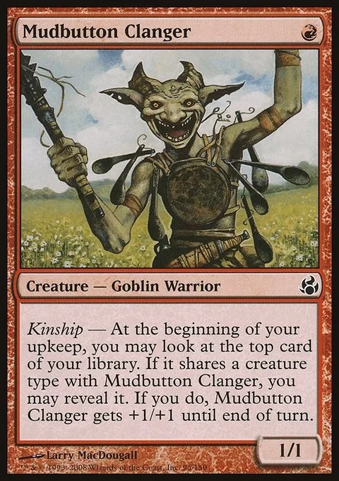 Kinship — At the beginning of your upkeep, you may look at the top card of your library. If it shares a creature type with Mudbutton Clanger, you may reveal it. If you do, Mudbutton Clanger gets +1/+1 until end of turn.