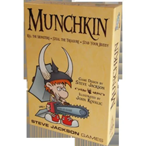 Munchkin is the mega-hit card game about dungeon adventure . . . with none of that stupid roleplaying stuff. You and your friends compete to kill monsters and grab magic items. And what magic items! Don the Horny Helmet and the Boots of Butt-Kicking. Wield the Staff of Napalm . . . or maybe the Chainsaw of Bloody Dismemberment. Start by slaughtering the Potted Plant and the Drooling Slime, and work your way up to the Plutonium Dragon . . .