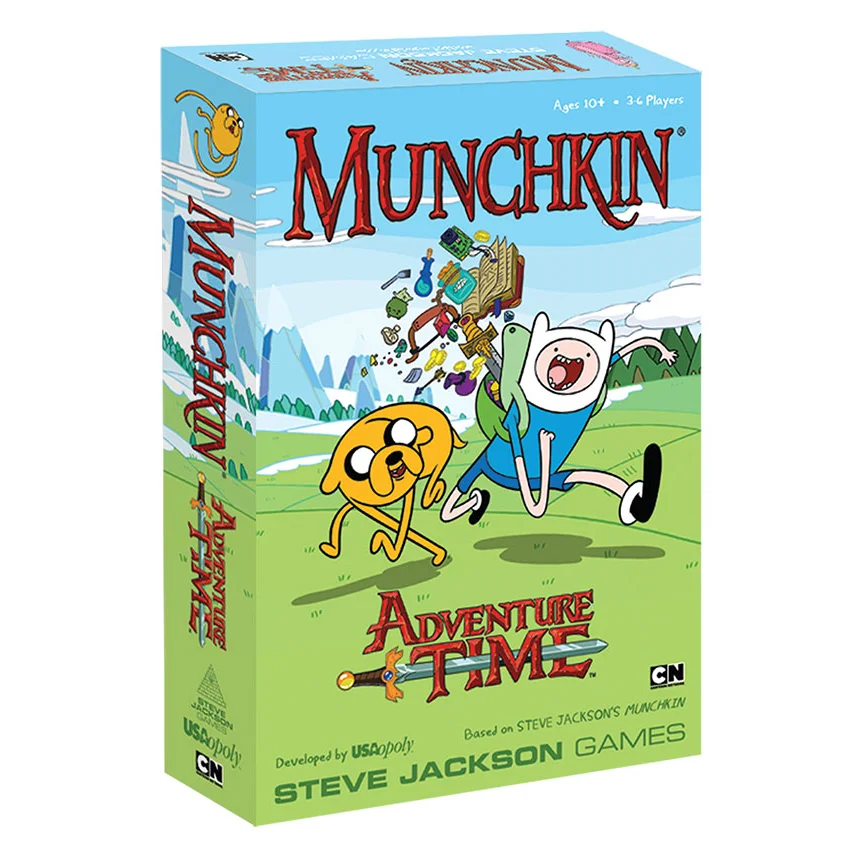 Join Jake, Finn, and the rest of the Adventure Time gang in Munchkin Adventure Time! Battle to ward off foes, avoid magical curses, and fight monsters in an attempt to reach level 10 and win the game! Plus, now in a Munchkin FIRST, play as one of your 8 favorite characters with new custom character cards, each possessing a power that stays with you throughout the game (gender switches still included). Play Munchkin Adventure Time on its own, or jam-mash it with other Munchkin games.