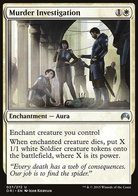 Enchant creature you control When enchanted creature dies, create X 1/1 white Soldier creature tokens, where X is its power.