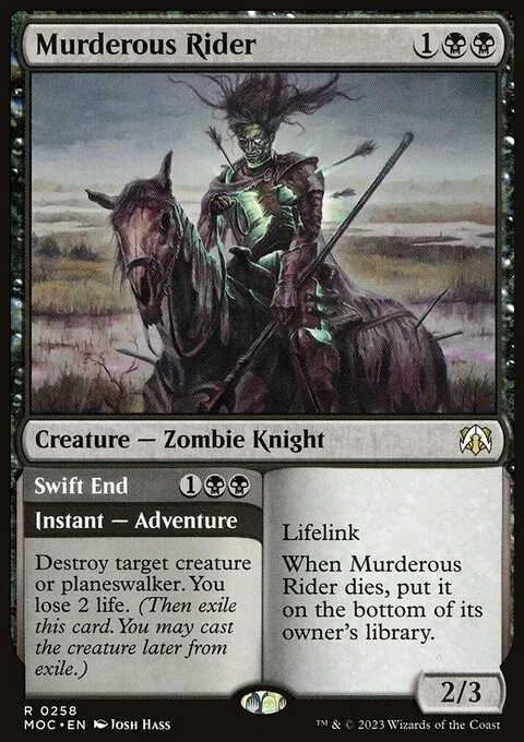 Murderous Rider Lifelink When this creature dies, put it on the bottom of its owner's library. Swift End Destroy target creature or planeswalker. You lose 2 life. (Then exile this card. You may cast the creature later from exile.)