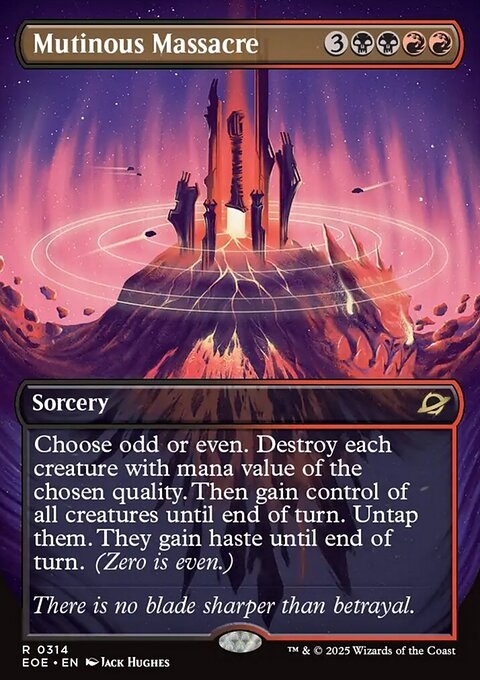 Choose odd or even. Destroy each creature with mana value of the chosen quality. Then gain control of all creatures until end of turn. Untap them. They gain haste until end of turn. (Zero is even.)