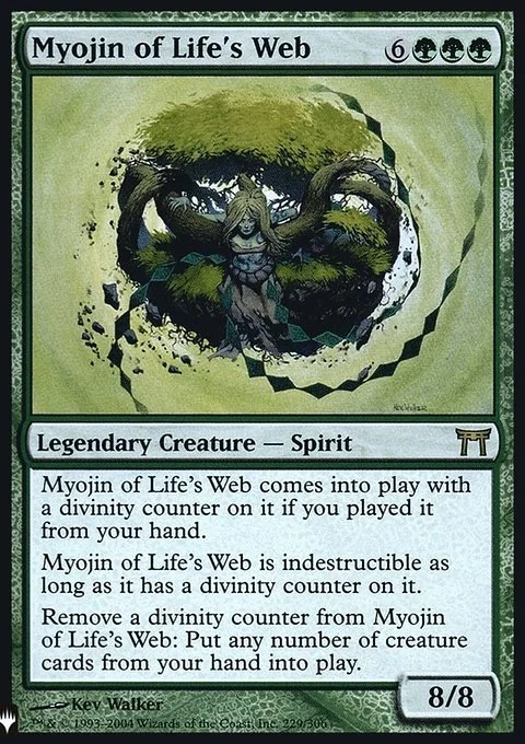 Myojin of Life's Web enters with a divinity counter on it if you cast it from your hand. Myojin of Life's Web has indestructible as long as it has a divinity counter on it. Remove a divinity counter from Myojin of Life's Web: Put any number of creature cards from your hand onto the battlefield.