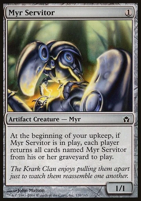 At the beginning of your upkeep, if Myr Servitor is on the battlefield, each player returns all cards named Myr Servitor from their graveyard to the battlefield.