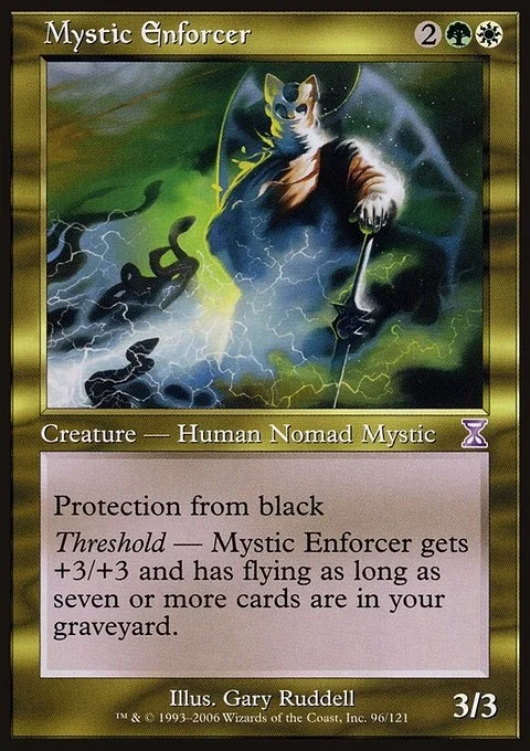 Protection from black Threshold — As long as seven or more cards are in your graveyard, Mystic Enforcer gets +3/+3 and has flying.