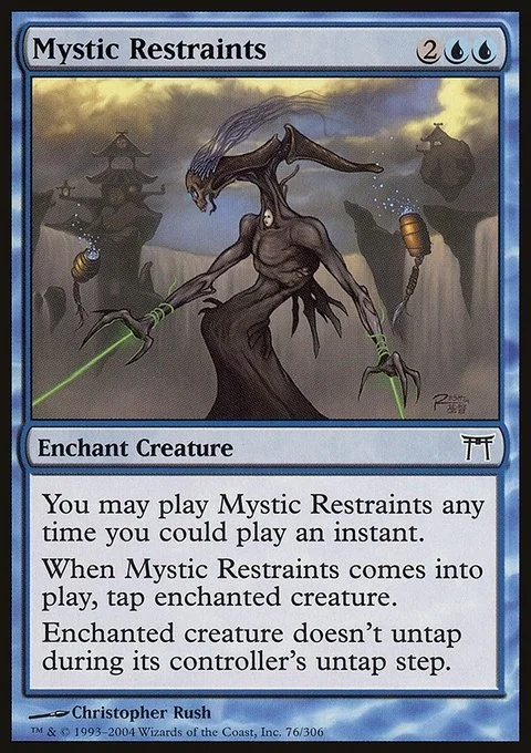 Flash Enchant creature When Mystic Restraints enters, tap enchanted creature. Enchanted creature doesn't untap during its controller's untap step.