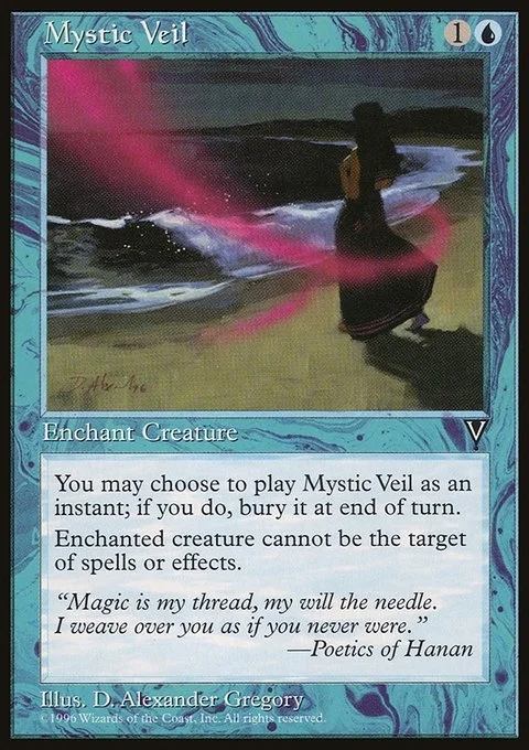 You may cast Mystic Veil as though it had flash. If you cast it any time a sorcery couldn't have been cast, the controller of the permanent it becomes sacrifices it at the beginning of the next cleanup step. Enchant creature Enchanted creature has shroud. (It can't be the target of spells or abilities.)