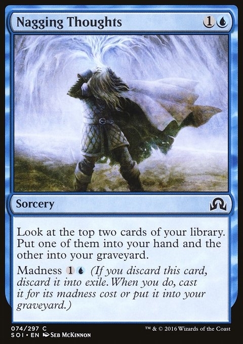Look at the top two cards of your library. Put one of them into your hand and the other into your graveyard. Madness {1}{U} (If you discard this card, discard it into exile. When you do, cast it for its madness cost or put it into your graveyard.)